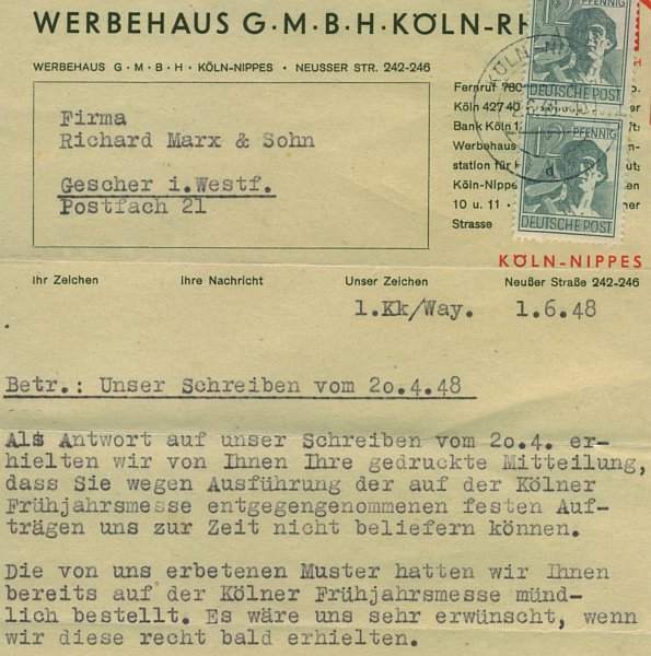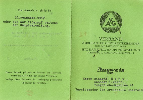 1949 starb Richard Marx sen. und sein Sohn Bernhard Marx übernahm gemeinsam mit seiner Frau Elisabeth die Firma in Gescher. Sie bauten das Sortiment für die Schausteller Zug um Zug aus. Zuerst kamen Wedel (Neckfedern), einfache Tröten (Trompeten), Neckbälle und andere einfache und leichte Artikel hinzu; eben solche Artikel, die mit dem Fahrrad leicht transportiert werden konnten. Bis 1950 war das Zweirad, neben dem Eisenbahnversand, das Transportmittel der ersten Wahl. Mit dem Erwerb des Führerscheins durch Bernhard Marx im September 1950 und der Anschaffung des ersten kleinen DKW-Kastenwagens waren die Transportprobleme zu den Schaustellern endlich gelöst. Durch diese neu gewonne Mobilität machte der Ausbau dieses Geschäftzweiges gute Fortschritte, zumal die Kunstblumenproduktion immer mehr zurück ging.